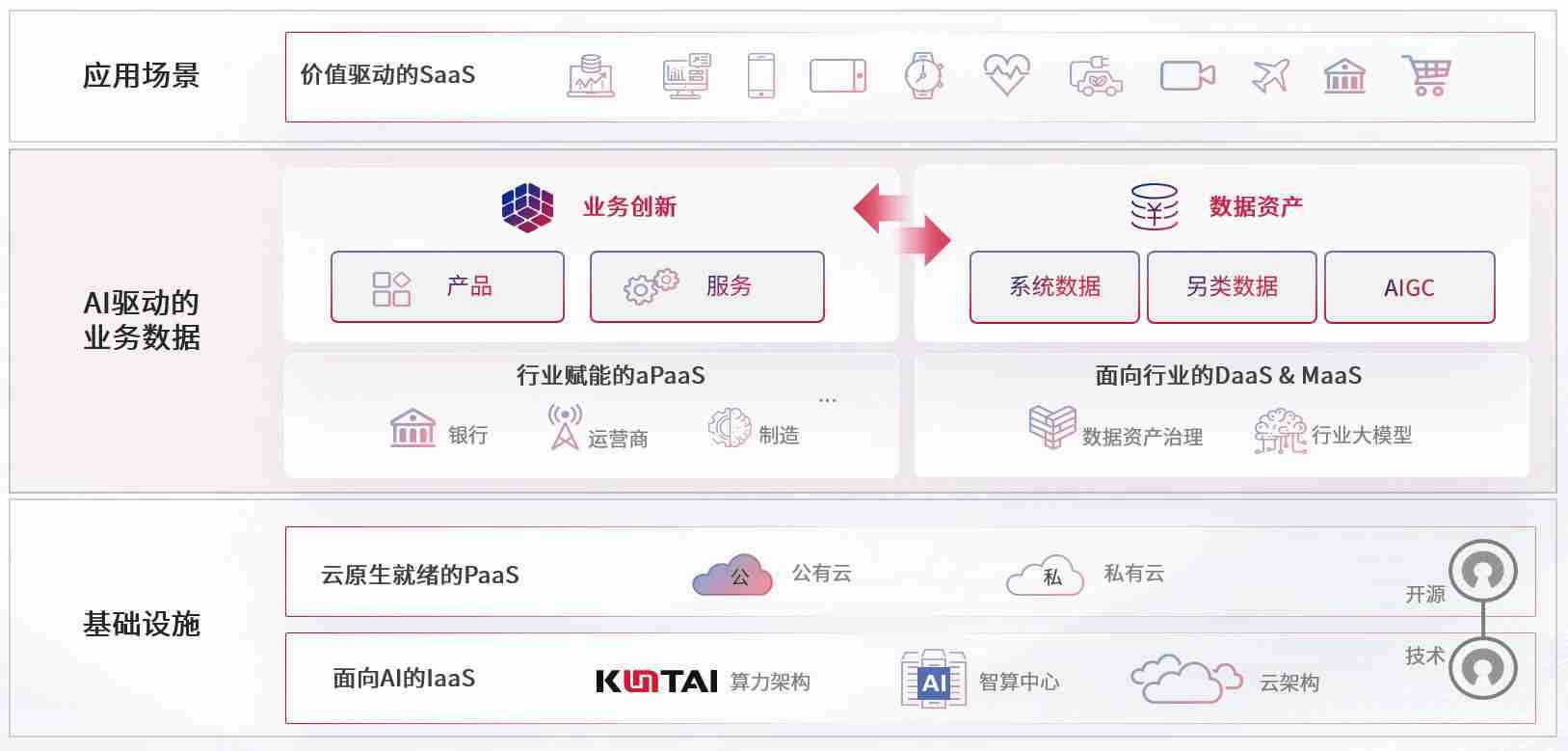 数字时代,,围绕企业数字化转型的关键要素,,,,壹号娱乐数码开创性的提出数云融合战略和技术体系框架,,着力在云原生、、、数字原生、、、AI原生和信创产业上架构产品和服务能力,,为处在不同数字化转型阶段的快消零售、、、汽车、、金融、、医疗、、政企、、、、教育、、、运营商等行业客户提供泛在的敏捷IT能力和融合的数据驱动能力,,,,构建跨界融合创新的数字业务场景和新业务模式,,助力企业级客户建立面向未来的核心能力和竞争优势,,,,全面推动社会的数字化、、、、智能化转型升级。。。