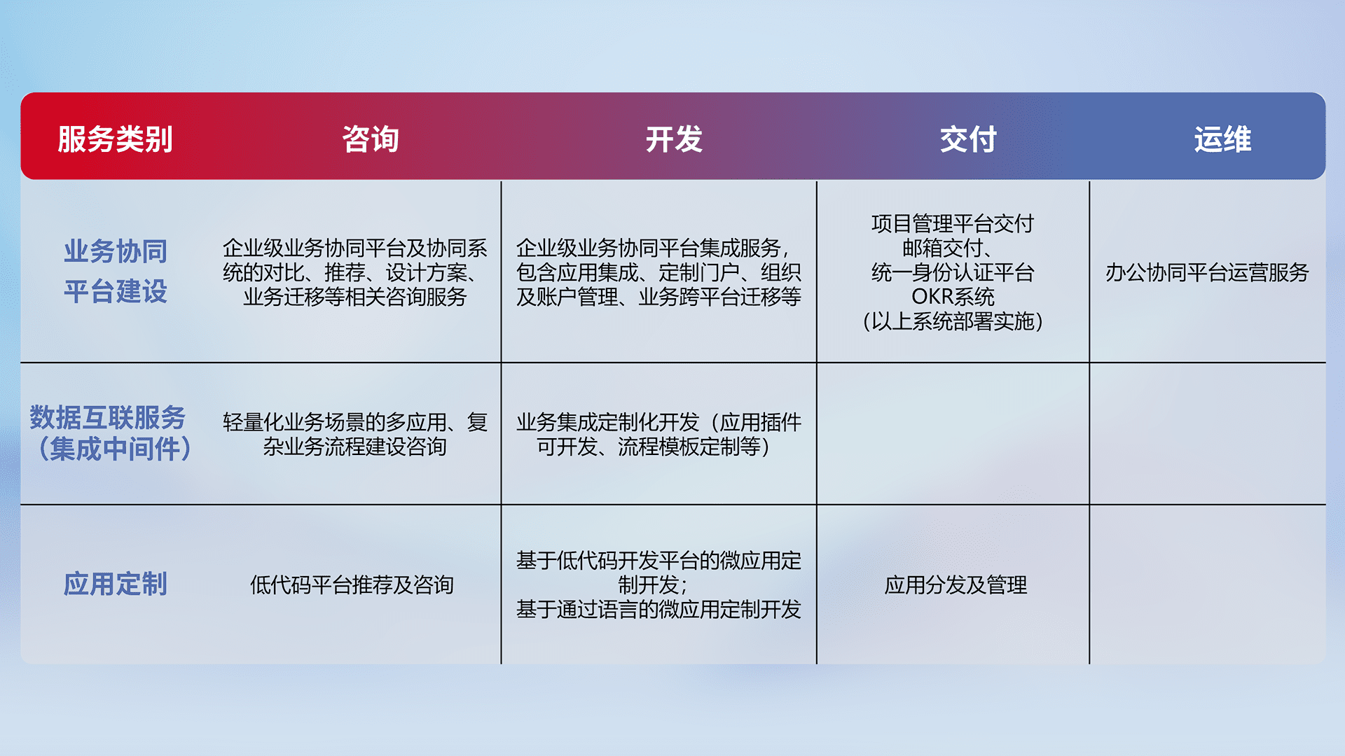 针对钉钉、、、、企微、、IDaas等平台级产品提供产品的规划、、、、方案、、、、交付、、、定制化开发等服务,,,实现如统一协同办公、、、智能客户服务、、混合会议管理、、、、智能数据查询、、、、等业务场景,,,实现数字化转型。。